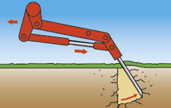 As shown above the tine enters the ground and penetrates down to the predetermined depth as set by the operator, whilst underground the tine is forced backwards again to a set angle which breaks any hard panned layer up which allows the root system to grow downwards towards the previously hidden nutritional areas within the soil.